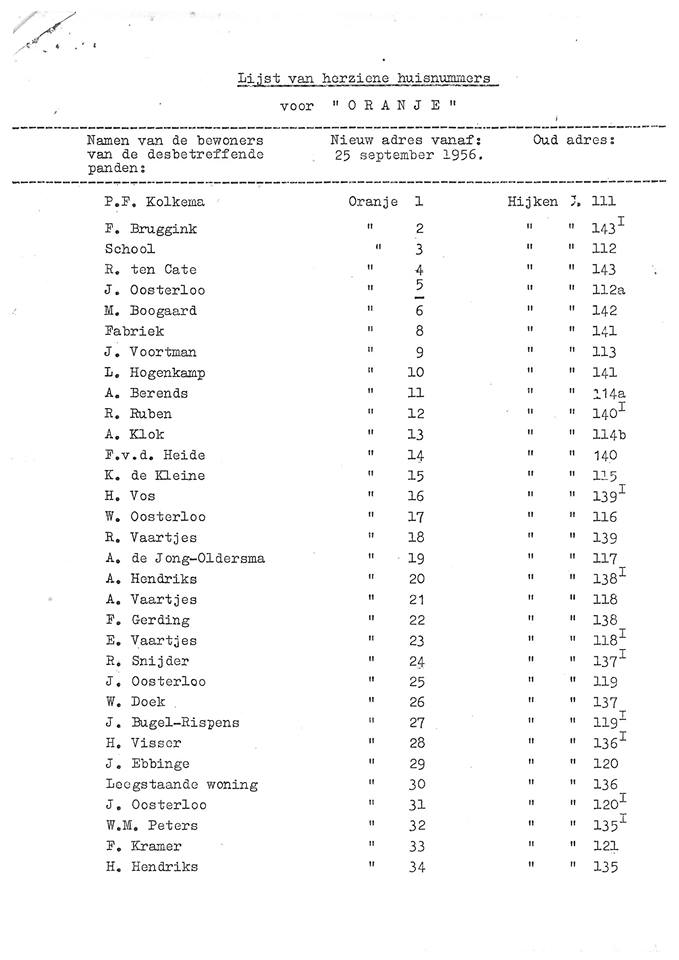 "Hier een document van 25 september 1956 waarin alle huisnummers in Hijken en Oranje zijn aangepast van de C nummers naar de nummering van heden inclusief de namen van de bewoners die er toen woonden."